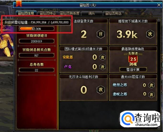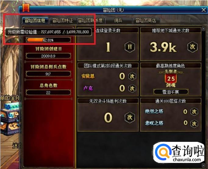 在冒险团信息一览,可以看到冒险团等级,以及冒险团升级的经验条,将鼠标移动至经验条,还可以看到冒险团升级所需要的经验。