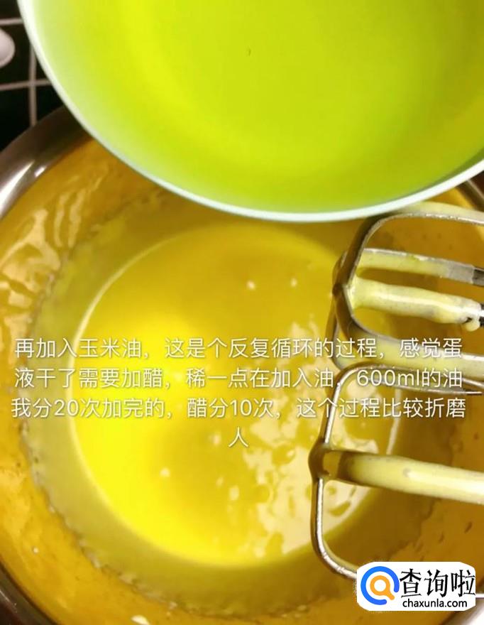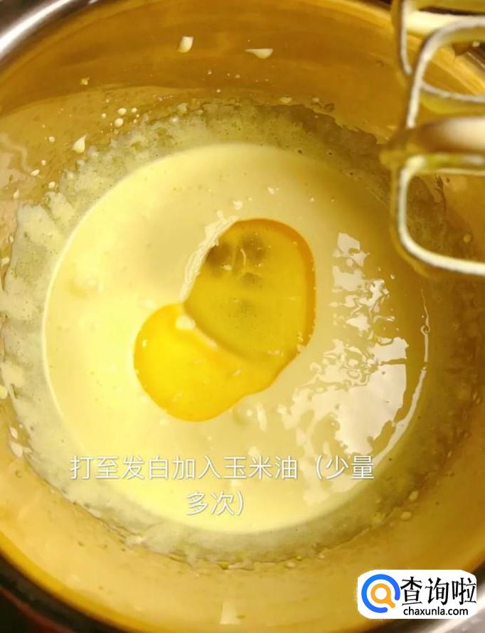接着将蛋液打发至发白,加入适量玉米油,如下图所示。小贴士:这个过程应该分多次进行,才会比较合适。