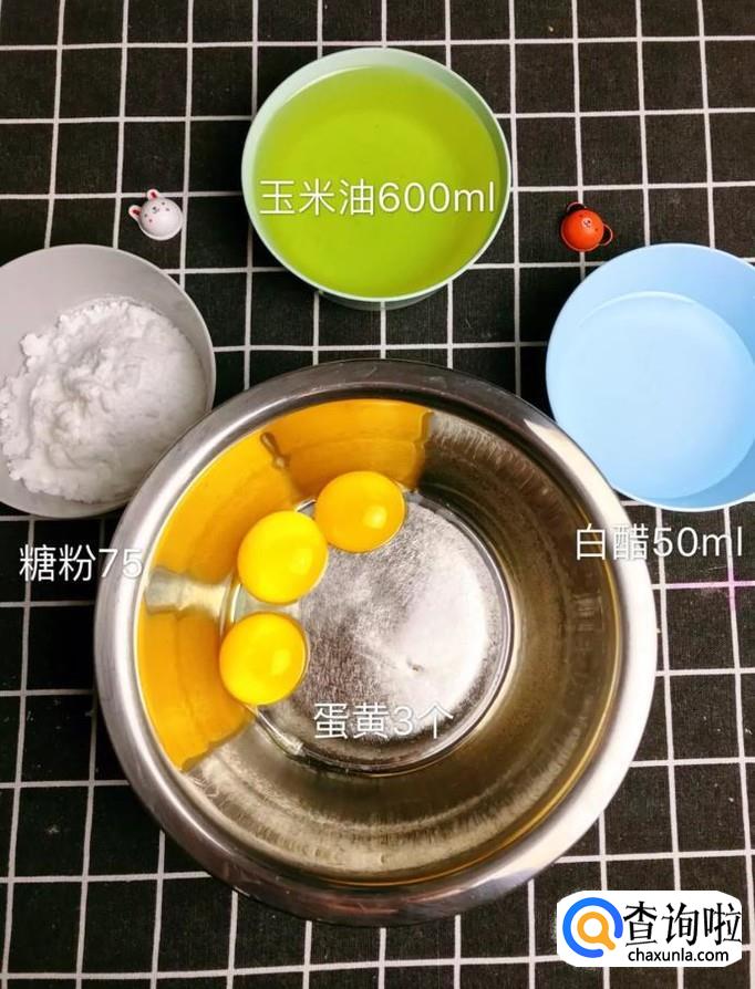 首先准备好所有要用到的食材,如下图所示。小贴士:玉米油600ml,糖粉75克,蛋黄三个,白醋50ml。