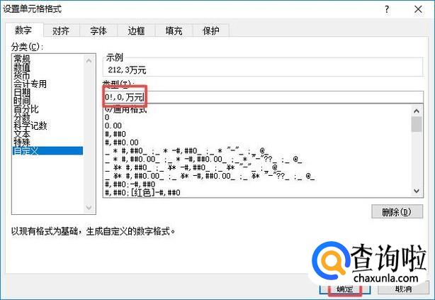 弹出的界面,我们在类型中输入0!,0,万元,之后点击确定;