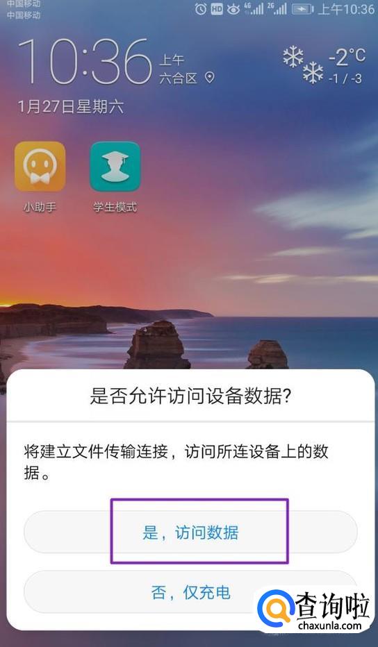 首先,我们将手机插入电脑的USB接口处,手机上面的显示,我们选择:是,访问数据;