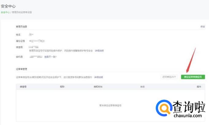 在运营者管理页面中,找到“绑定管理员微信号”,然后开始输入你想绑定的微信号就可以了。