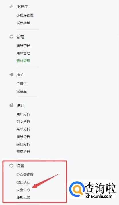 在微信公众号后台的设置菜单中,找到“安全中心”。