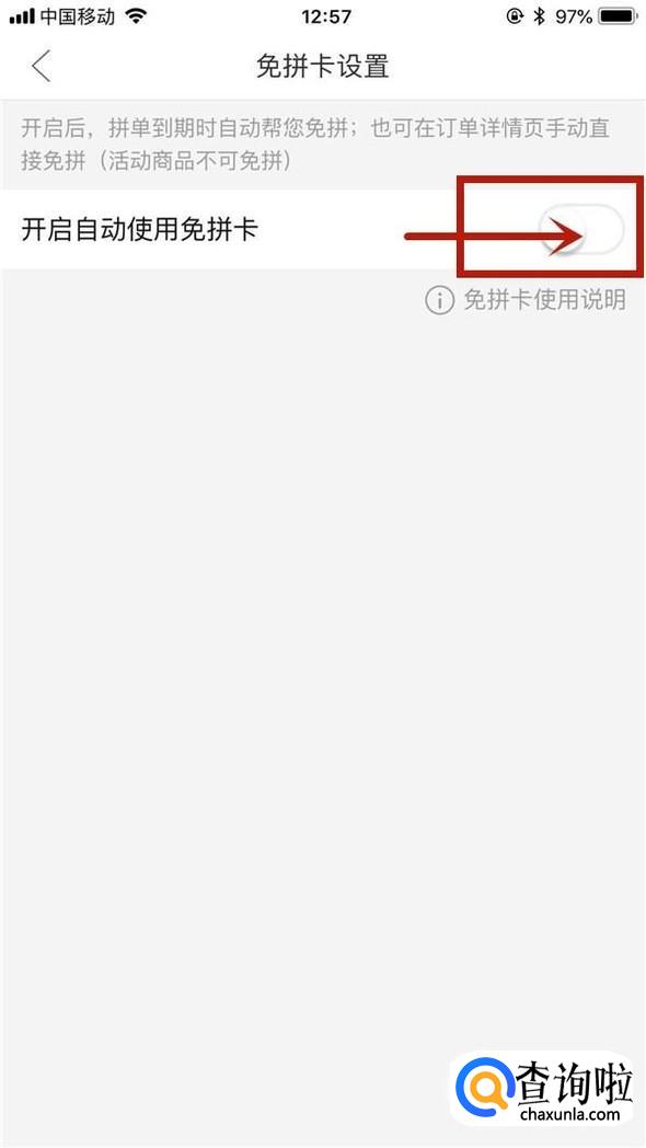 最后点击开启自动使用免拼卡开关按钮,下次购物的时候就会自动使用了。