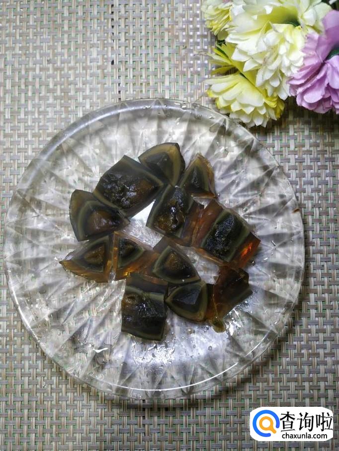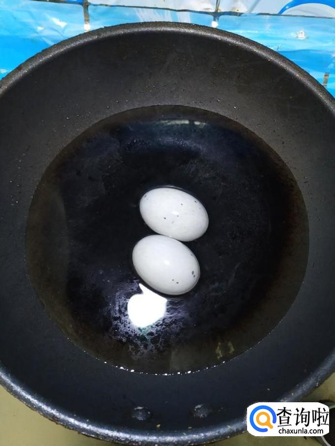 准备两个松花蛋,放入锅中,煮四分钟左右,然后取出,过凉水后,去皮切成块,放入盘中备用。