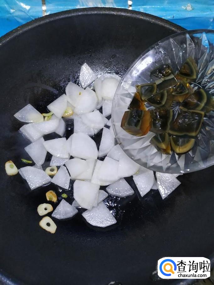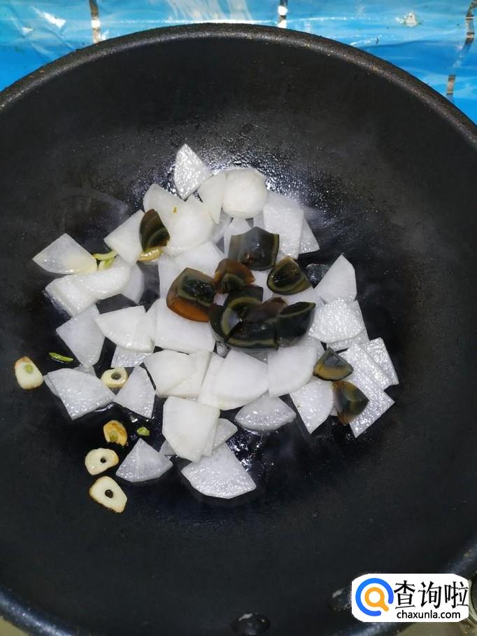 将松花蛋倒入锅中,和白萝卜一起翻炒均匀。
