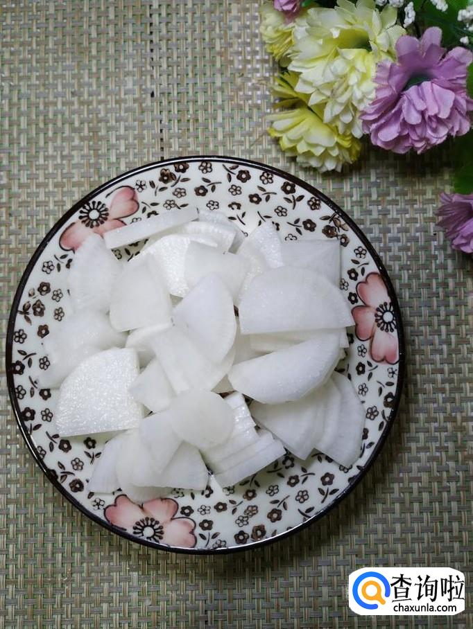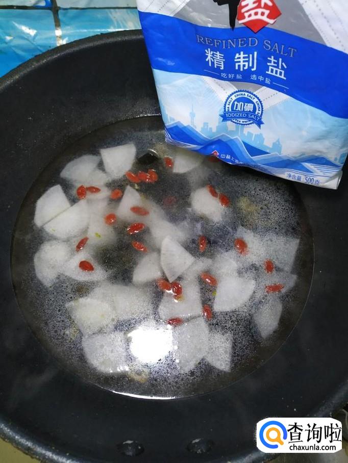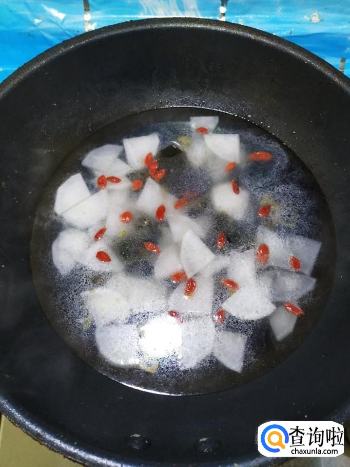 准备适量白萝卜,洗净去皮后,切成滚刀块,放入盘中备用,再准备适量枸杞子,放入水中泡发。