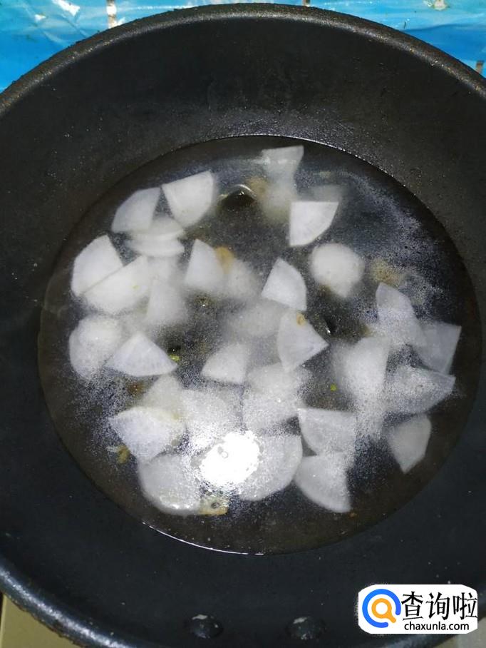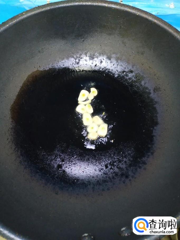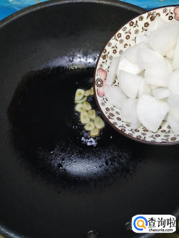 准备适量大蒜,洗净后切片备用,炒锅中放入适量油,油热后放入蒜片炒香,然后将白萝卜放入锅中,翻炒均匀。