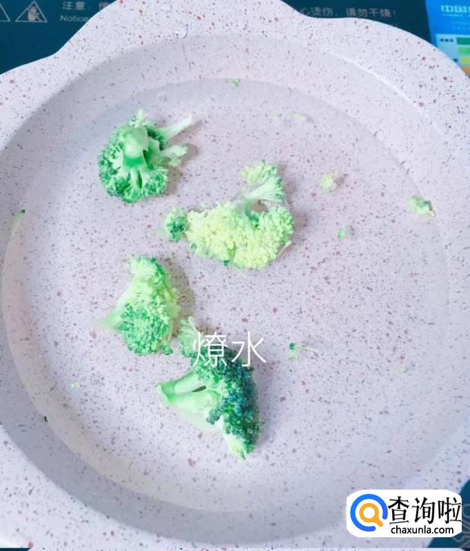 然后把西兰花摘成小朵,倒入锅中烫两分钟,捞出控干,如下图所示。