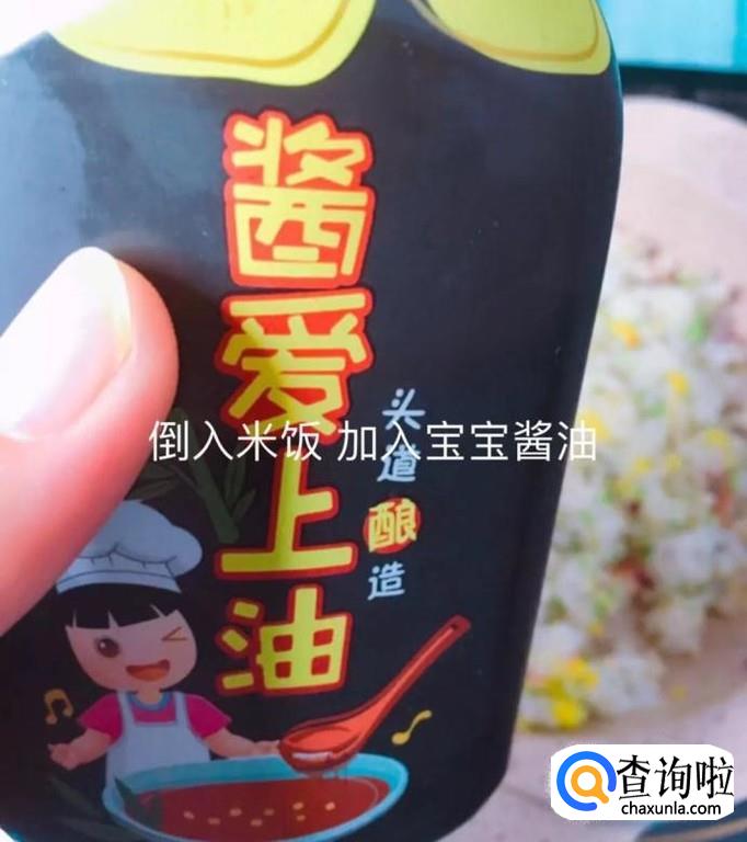然后把米饭加进锅中翻炒两分钟并加入适量的宝宝酱油,如下图所示。