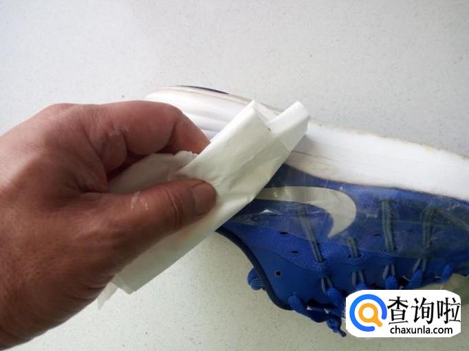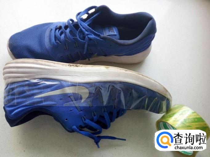 在鞋边的上方,用透明胶布把鞋转圈粘一下,这样避免在刷洗鞋边的时候,弄脏鞋面。