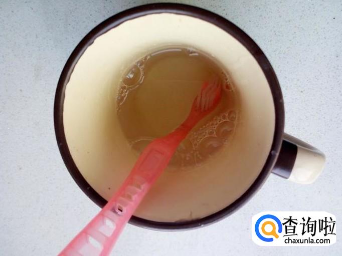 在碗里滴入适量的洗洁精,兑水,用牙刷搅拌均匀(平时使用过的废弃牙刷)。