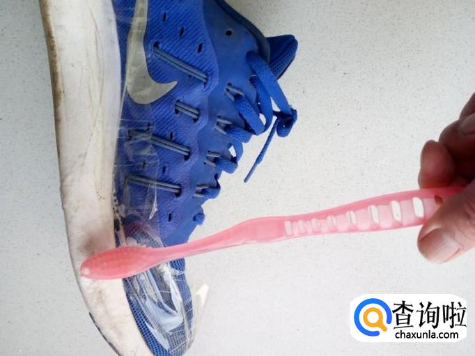 把牙膏挤在鞋边上(最好是增白之类的牙膏),用牙刷把牙膏均匀的涂抹在鞋边上,然后用牙刷蘸点水反复在鞋边上刷洗。污渍比较严重,不容刷洗掉的地方,就再挤些牙膏刷洗一下。