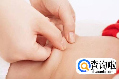 双手食指弯曲,用其与拇指相邻的第二关节处侧面,轻轻抵靠在宝小儿的尾骨,(脊椎的最后一段骨节),拇指与食指一同轻捏住皮肤,并温柔地慢慢往上拉起。