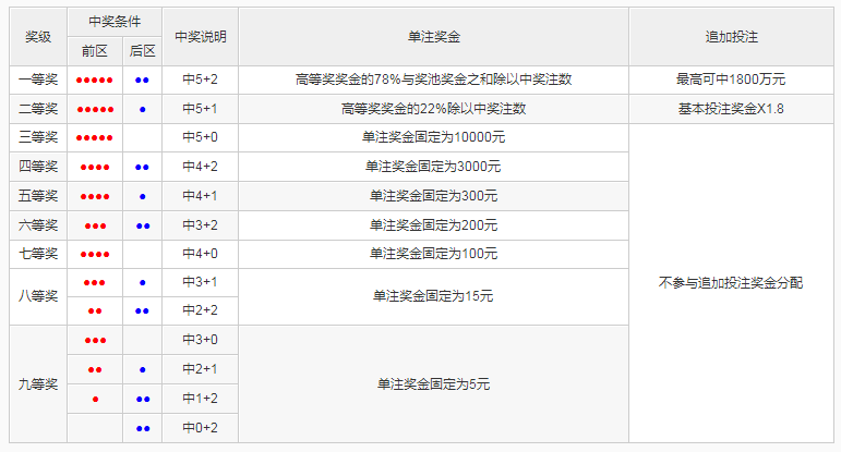 3、追加投注仅参与浮动奖的奖金分配。如追加投注中得浮动奖,则追加投注单注奖金为当期基本投注对应单注奖金的80%。