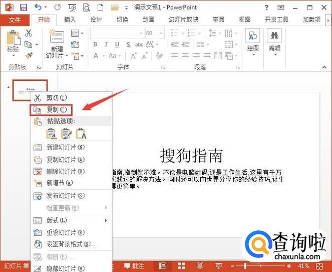 打开文件之后再在左侧选择需要复制的幻灯片单击鼠标右键找到复制选项,如图所示: