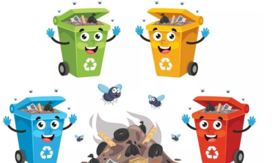 垃圾桶等收集设施也按照分类标准统一图文标识,区分不同颜色,即可回收物-蓝色、有害垃圾-红色、湿垃圾-棕色、干垃圾-黑色。