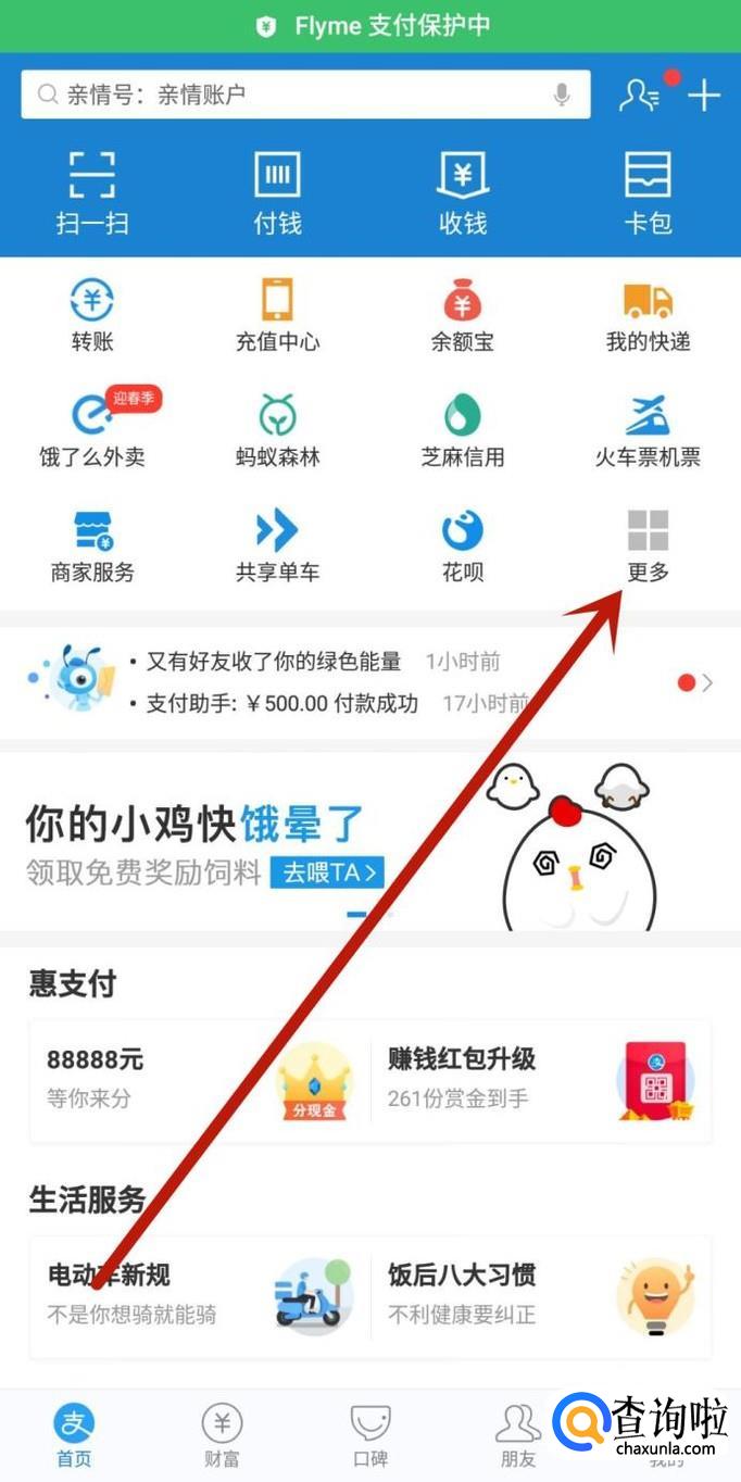 在乘坐公交车的时候,点击支付宝首页的“付钱”,如图所示。