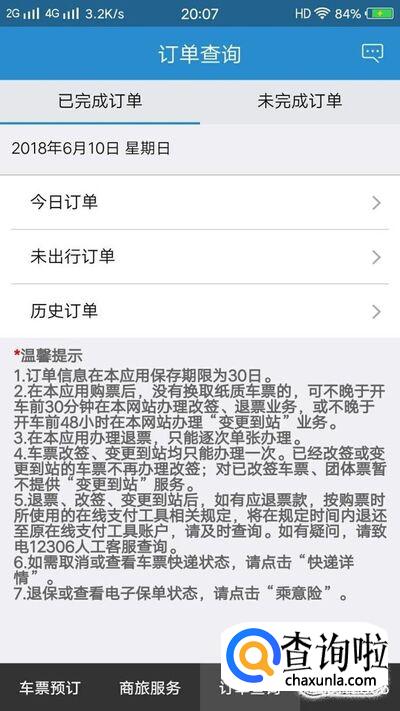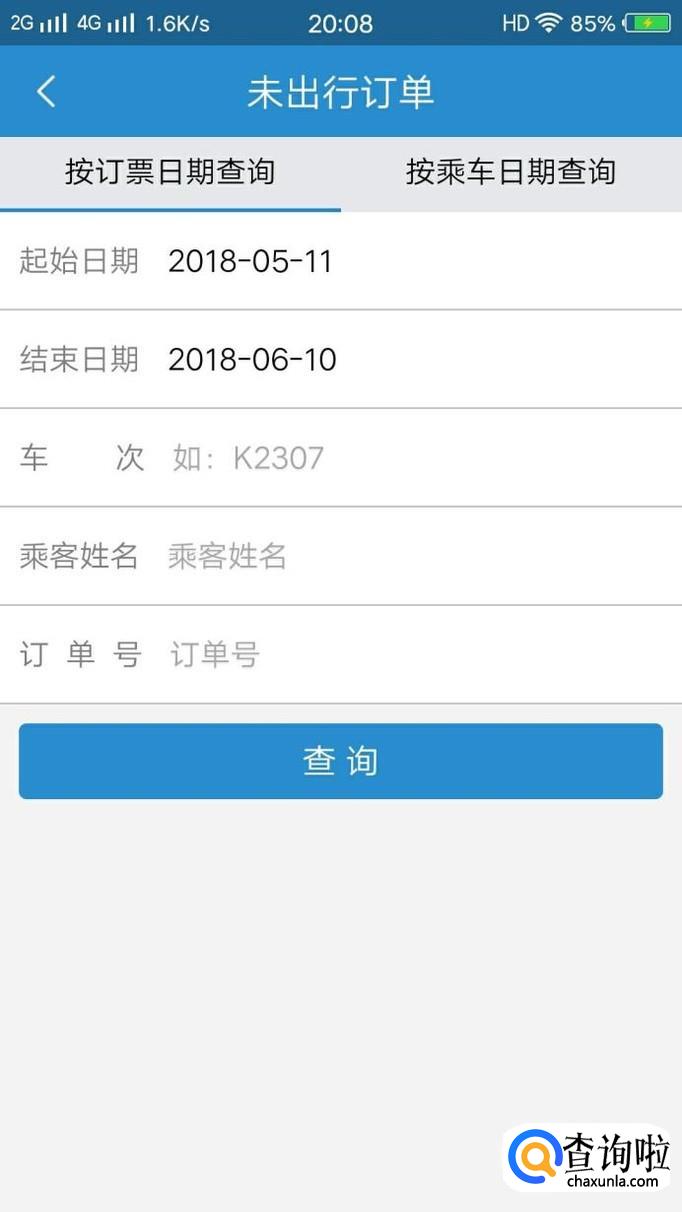 按着“订票日期查询”,设置好日期,点击“查询”即可看到未出行订单,如图所示。