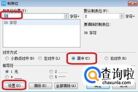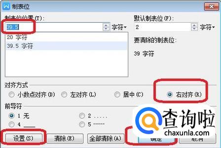 接着添加制表位39.5,对齐方式选择“右对齐”,点击“设置”添加,设置完成后点击“确定”。
