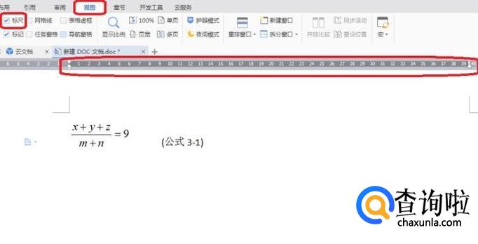 点击标题栏“视图”按钮,并在下方工具栏中勾选“标尺”,则在文档页面的左侧和上部出现标尺,我们看到文档宽度大概是40不到,所以我们设定居中是20,靠右是39.5。
