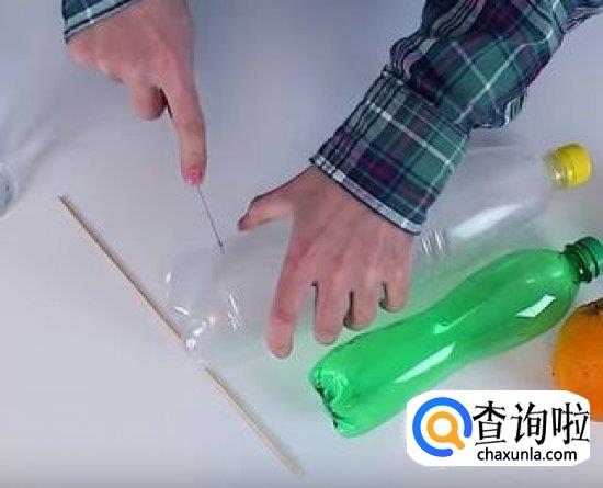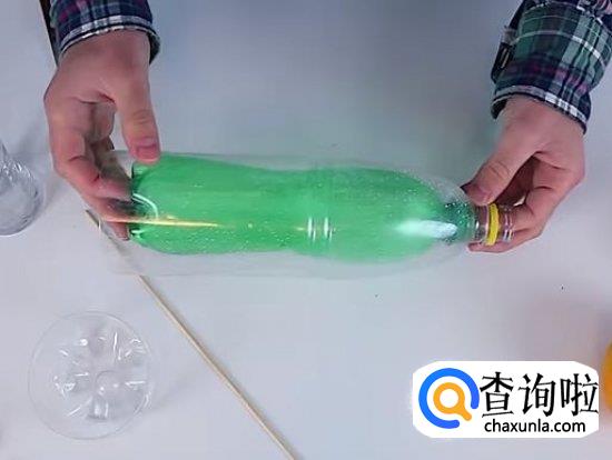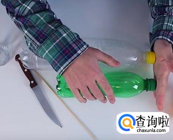 将小瓶从切口放进大瓶中,让它完全遮住大瓶的瓶口。接着找到小瓶的中间位置,并用竹签穿过两个瓶,让小瓶无法转动。