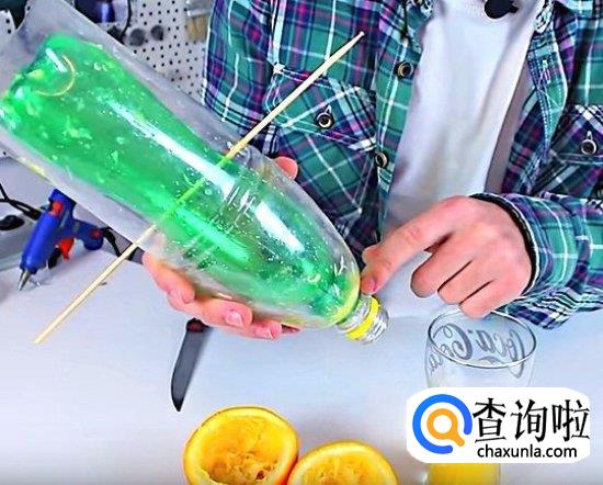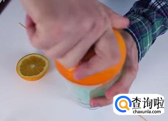 然后将橙子放在小瓶的瓶底上转动挤压即可榨出汁,橙汁就会流进杯里。