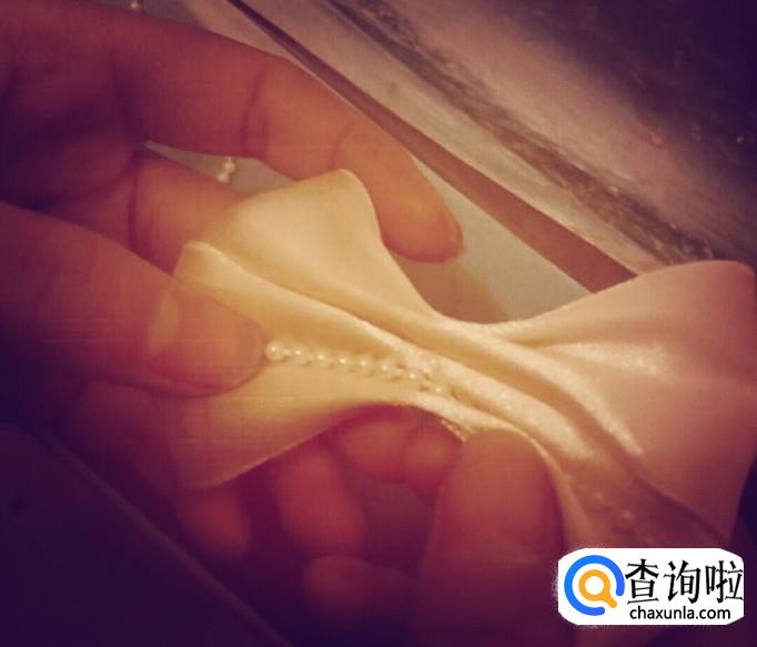 剪两节比蝴蝶结略短一点的小珠子粘在蝴蝶结上。