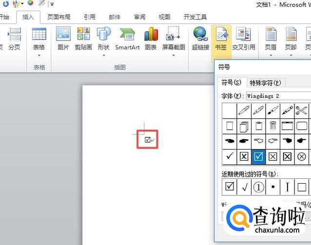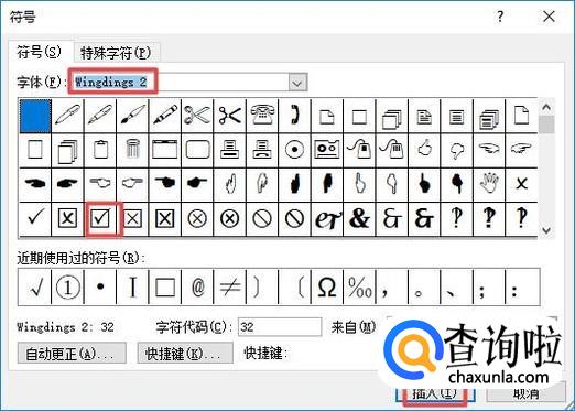 然后我们将字体中选择Wingdings 2,之后我们就可以看到在方框内打钩的符号了,我们点击选中,然后点击插入;