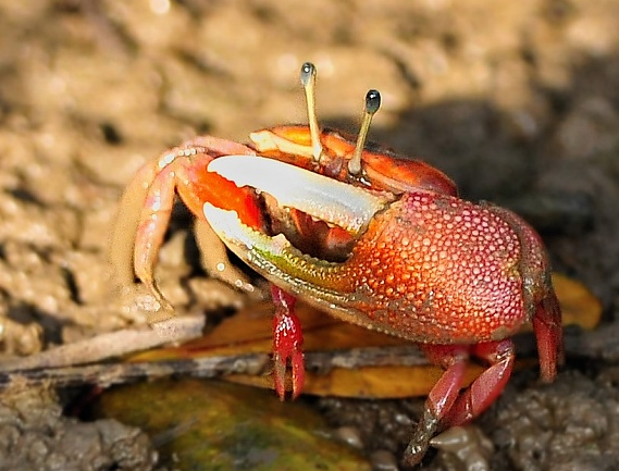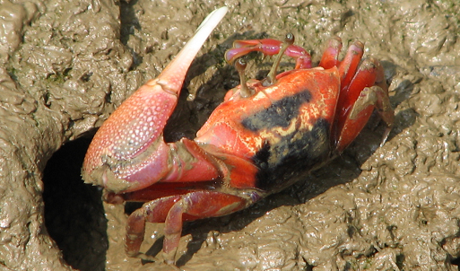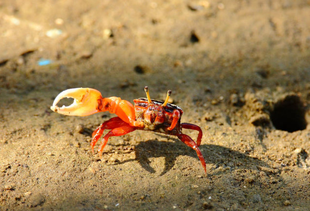 每当大海落潮后,就会有大量的招潮蟹从洞中钻出来到沙滩上觅食。可是,每当下一次潮水到来前10分钟,它们在沙滩上的一切活动便停止了,迅速返回老窝,于是人们就给它们起了招潮蟹这个有趣的名字。