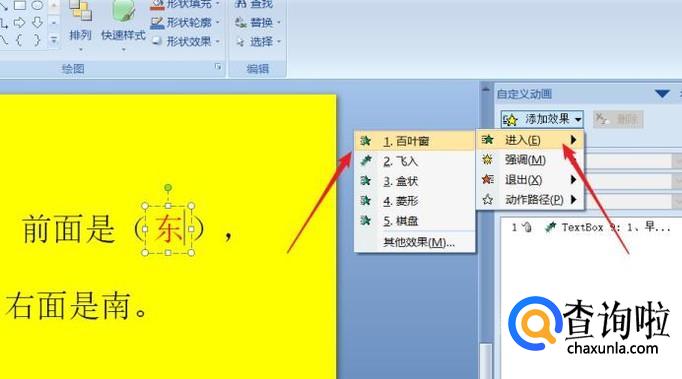 再次在右侧选择此文本框进入的效果。例如:“添加效果”--“进入”--“百叶窗”。播放此幻灯片时,单击鼠标时,填空题和答案会依次出现。