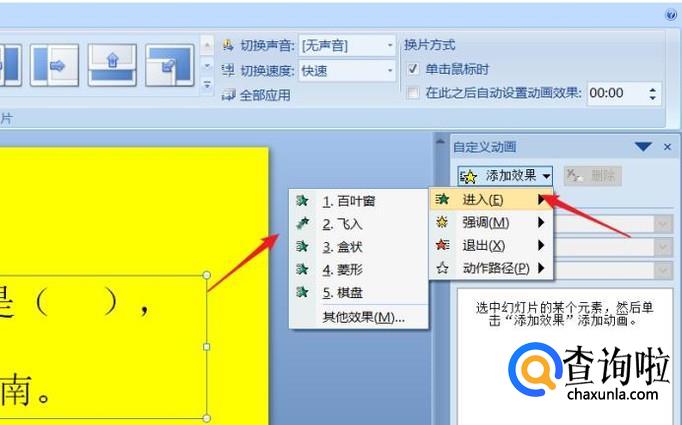 在工具栏内选择我们需要的效果。例如:“添加效果”--“进入”--“飞入”。