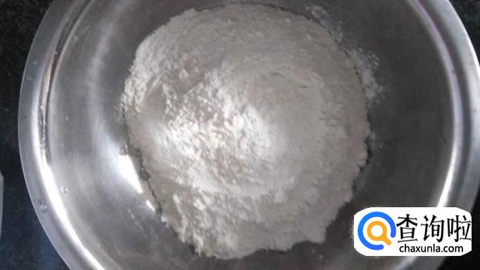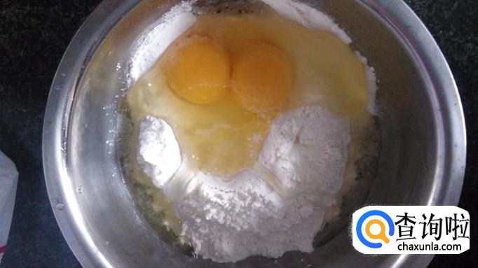 首先拿一个小盆来装面粉,这里的量呢看情况,假如只有你自己就放汤勺两勺的量,如果人多就多放一些,在面粉里打两个鸡蛋。