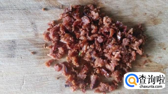 接下来把一些肉类的食物切成颗粒状,小编用的是香肠类,切得碎一点才更好熟哦。