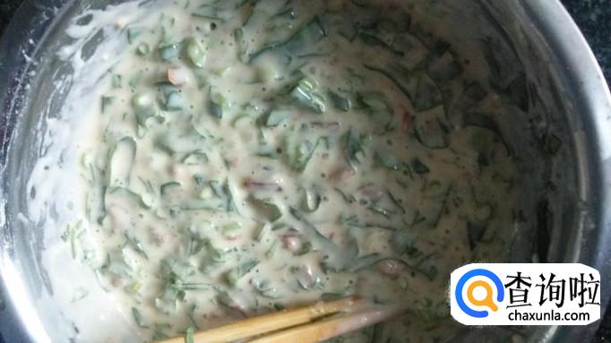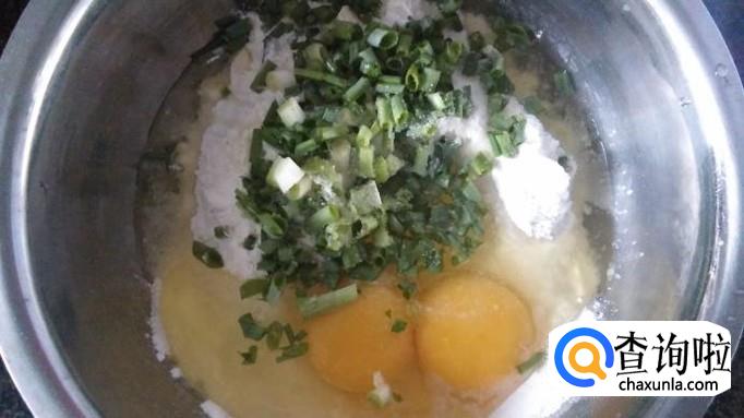 把切好的小葱放入面粉里,掺水搅拌成面糊状,不要太干了,不然做出来的饼不软。