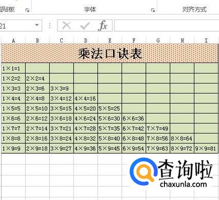 选中A1:I1;把这几个单元格合并;并输入文字:乘法口诀表