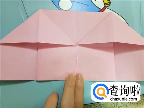 紧接着,我们沿着刚才折叠形成的中轴线轻轻的从上边压下来,并且整理一下形成两个小的三角形。