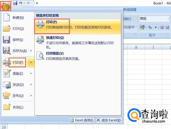 然后我们点击左上角的office按钮,弹出的界面,我们将鼠标移至打印处,弹出的界面,我们点击打印;