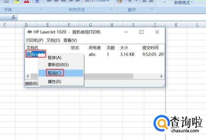 弹出的界面,我们就看到我们在打印的资料了,我们右击打印的资料,弹出的界面,我们点击取消;