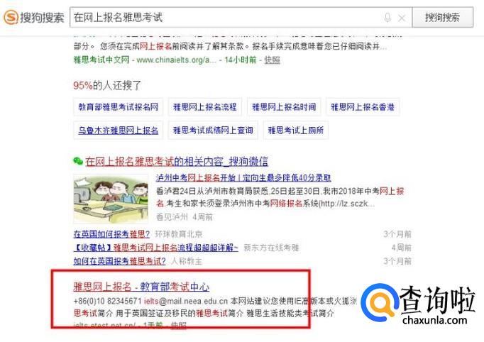 我们点开搜狗浏览器,在搜索栏中搜索“在网上报名雅思考试”,就可以找到教育部下面的一个正规报名网站。
