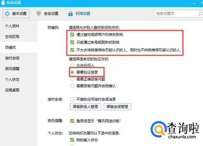 然后我们将请选择允许别人查找到您的方式中的所有选项全部勾选上,之后我们还需要点击需要验证信息,最新版本的QQ只能这么设置了。相信大家现在都会了。
