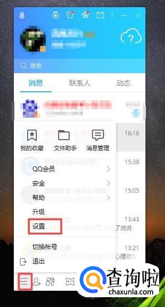 首先,我们打开我们的电脑,然后我们点击QQ,之后我们点击图示中的那个按钮,弹出的界面,我们点击设置;