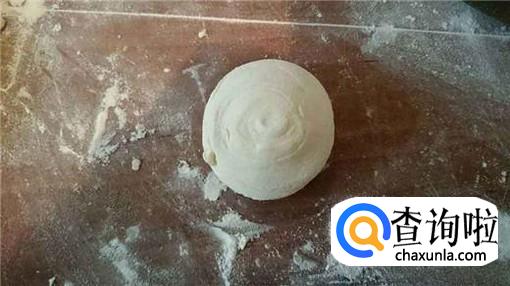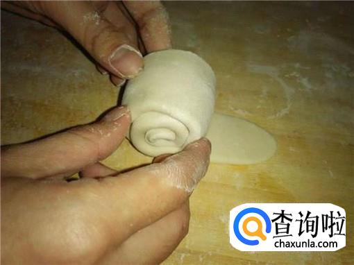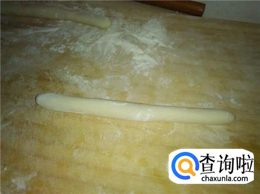 然后将面团揪成小剂子,并搓成长条,然后将长条用擀面杖压扁,再把长条卷成圆形。