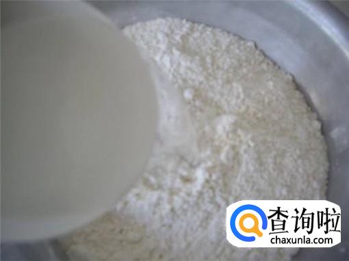 首先,我们将面粉倒入不锈钢盆中,加入适量的酵母和清水一起搅拌均匀,然后将面粉揉搓成面团,开始发酵半小时。