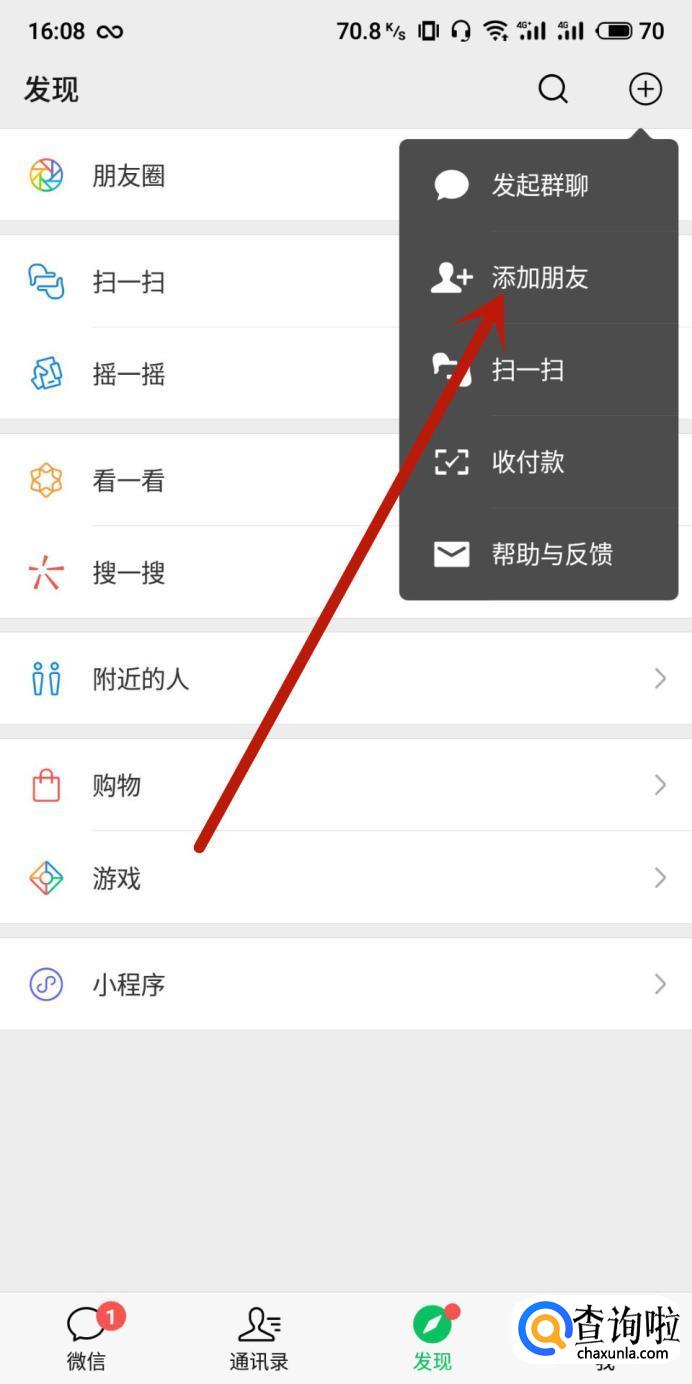 进入微信,点击图示位置的“添加朋友”,如图所示。
