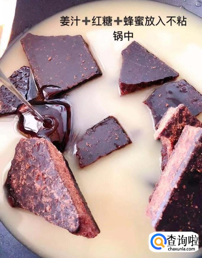 然后把生姜汁,红糖,蜂蜜,倒入不粘锅,如下图所示。