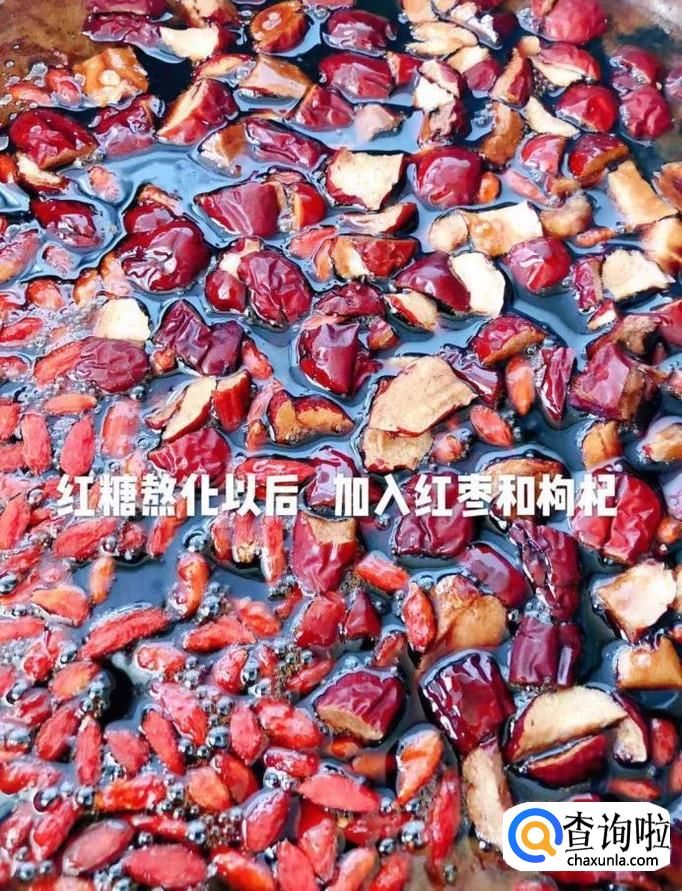 等到红糖完全融化,加入红枣和枸杞,开小火慢慢熬,如下图所示。