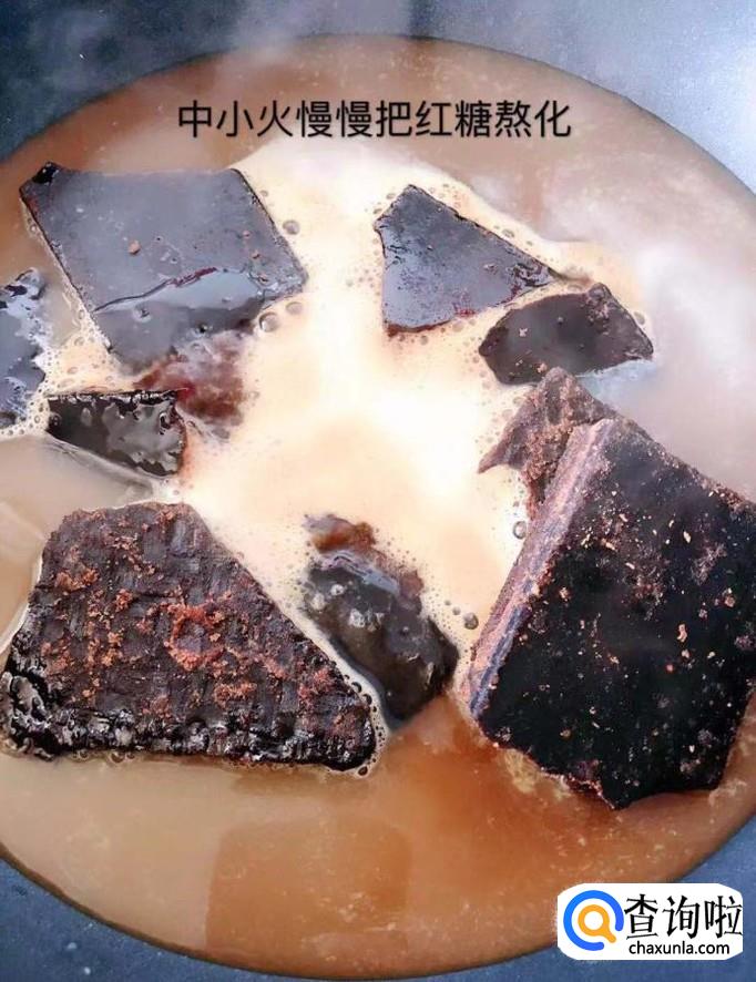 接着开中小火慢慢把红糖熬化,如下图所示。小贴士:大家在熬制红糖水的过程中千万别走开,以免红糖熬焦了。
