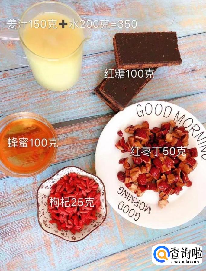 首先准备姜汁150克,水200克,蜂蜜100克,枸杞25克,红枣丁50克,红糖100克。