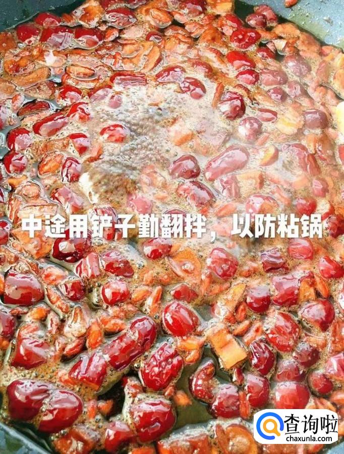 在熬制姜枣膏的时候,一定要用铲子不停的翻拌以免粘锅,如下图所示。